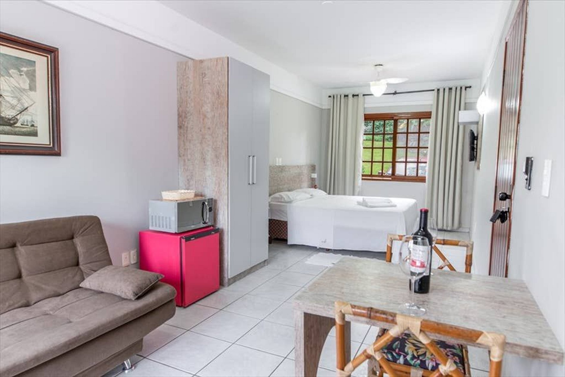 Apartamento ideal para casal e viajante a trabalho, ambiente limpo, amplo e arejado, possui frigobar, micro-ondas, uma mesa para trabalho, um sofá cama novo e muito confortável, Tv a cabo e acesso a internet, e ainda uma varanda com mesa e cadeiras, para contemplar o jardim.