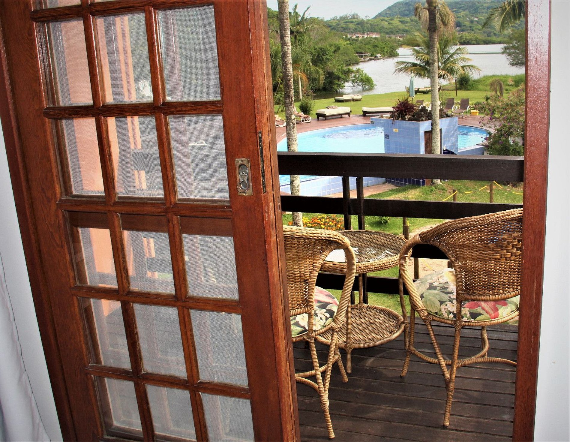 Lindo apartamento, decorado, possui uma cozinha planejada, bem equipada e espaçosa, com todos os utensílios que os hóspedes podem precisar, e a mais bela vista da sacada, que também possui uma pequena mesa e cadeiras para contemplar a Lagoa, piscina e jardins.
