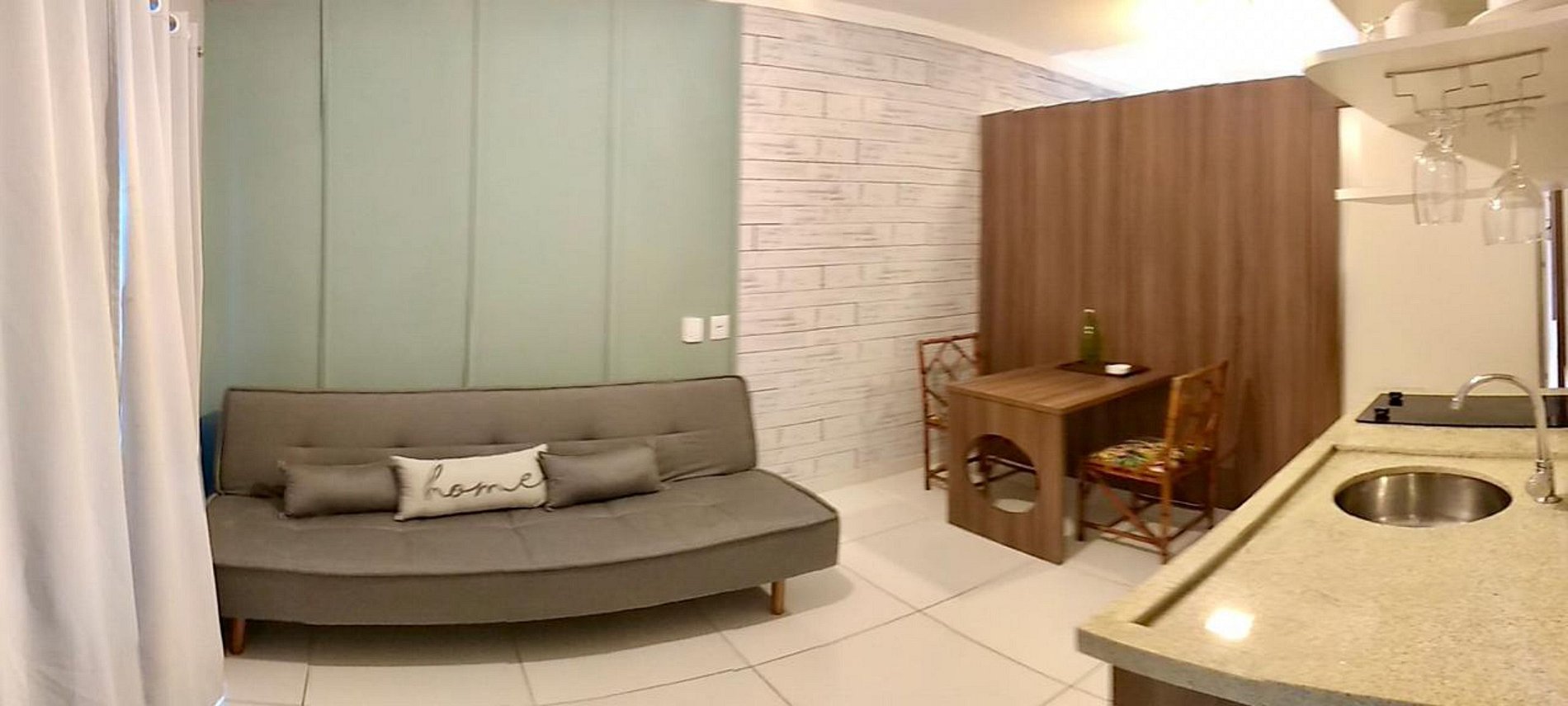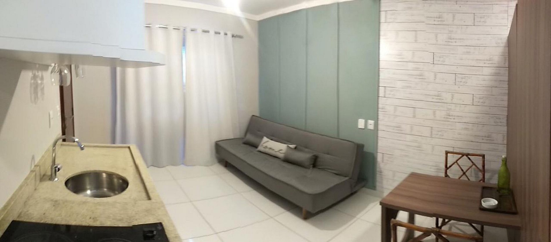 Ótimo apartamento para viagem a trabalho e casal com filho, fica no térreo, ambiente seguro e arejado. O quarto possui cama tamanho Queen. Possui uma cozinha completa, mesa para trabalho, um sofá cama muito confortável e uma varanda com mesa e cadeiras para contemplar o jardim e piscina.