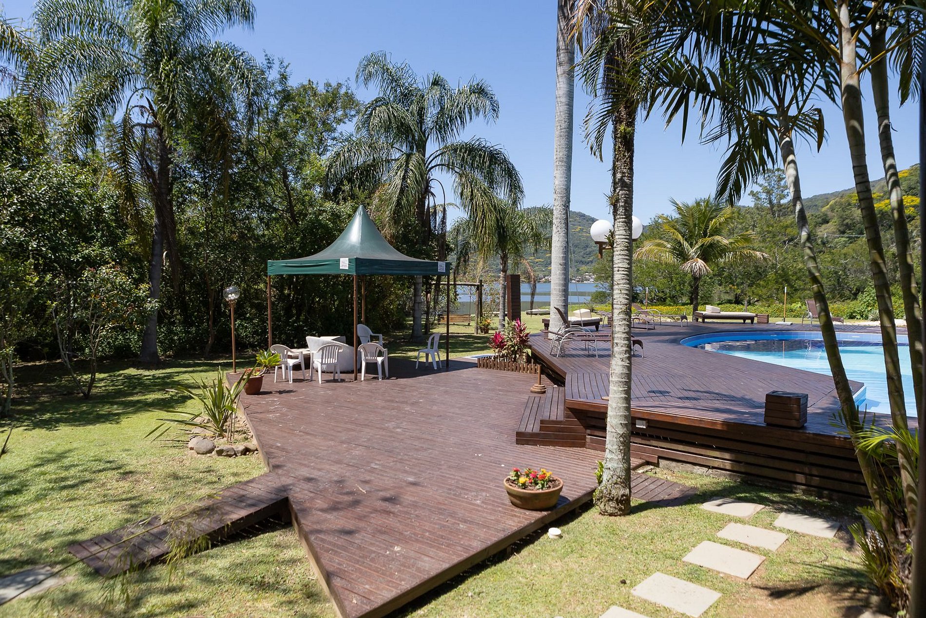 Varanda em frente a piscina com vista para Lagoa.